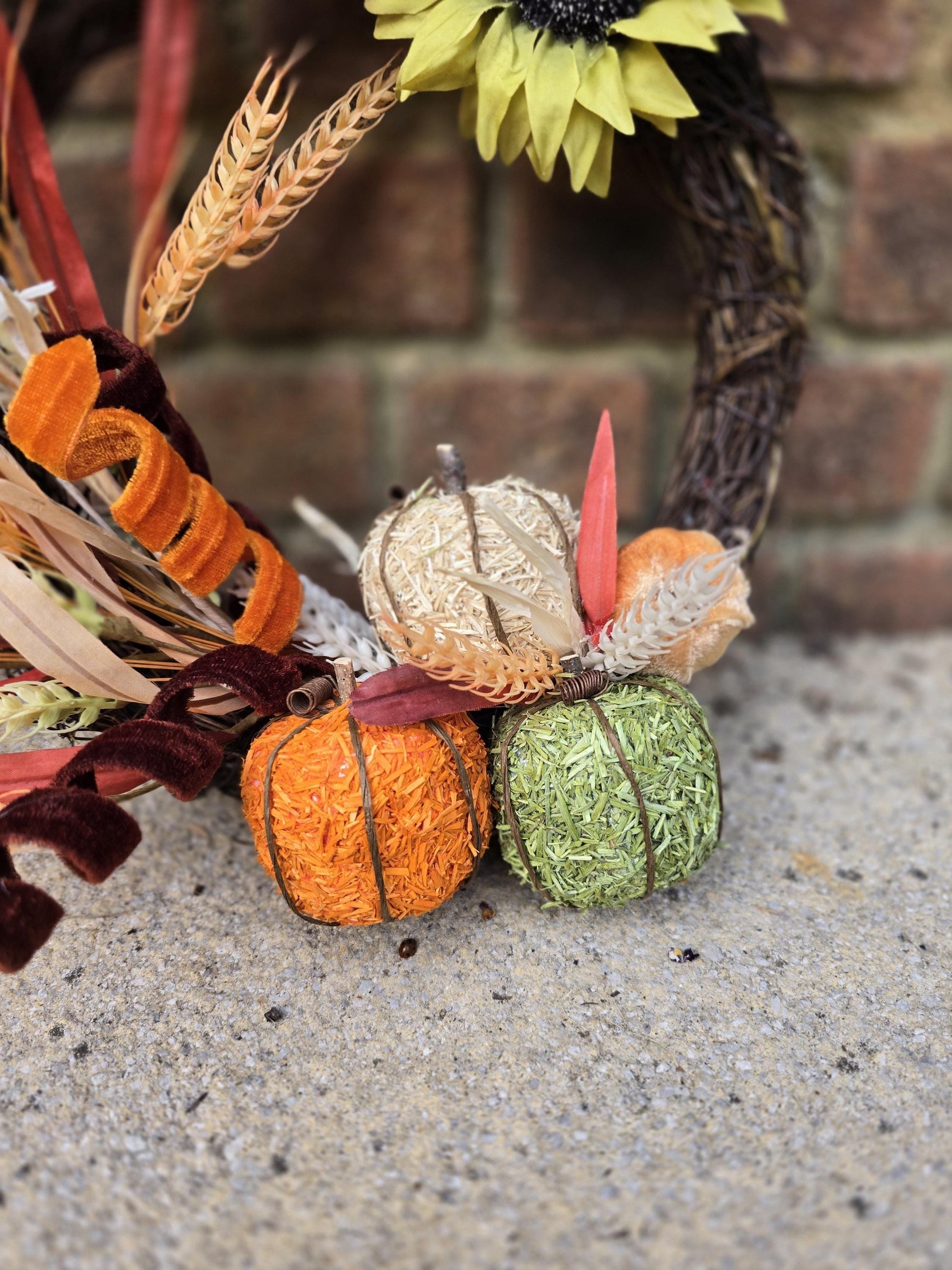 🎃 – Textured orange, cream, and sage/green pumpkins (natural fiber finish). Harvest Textures