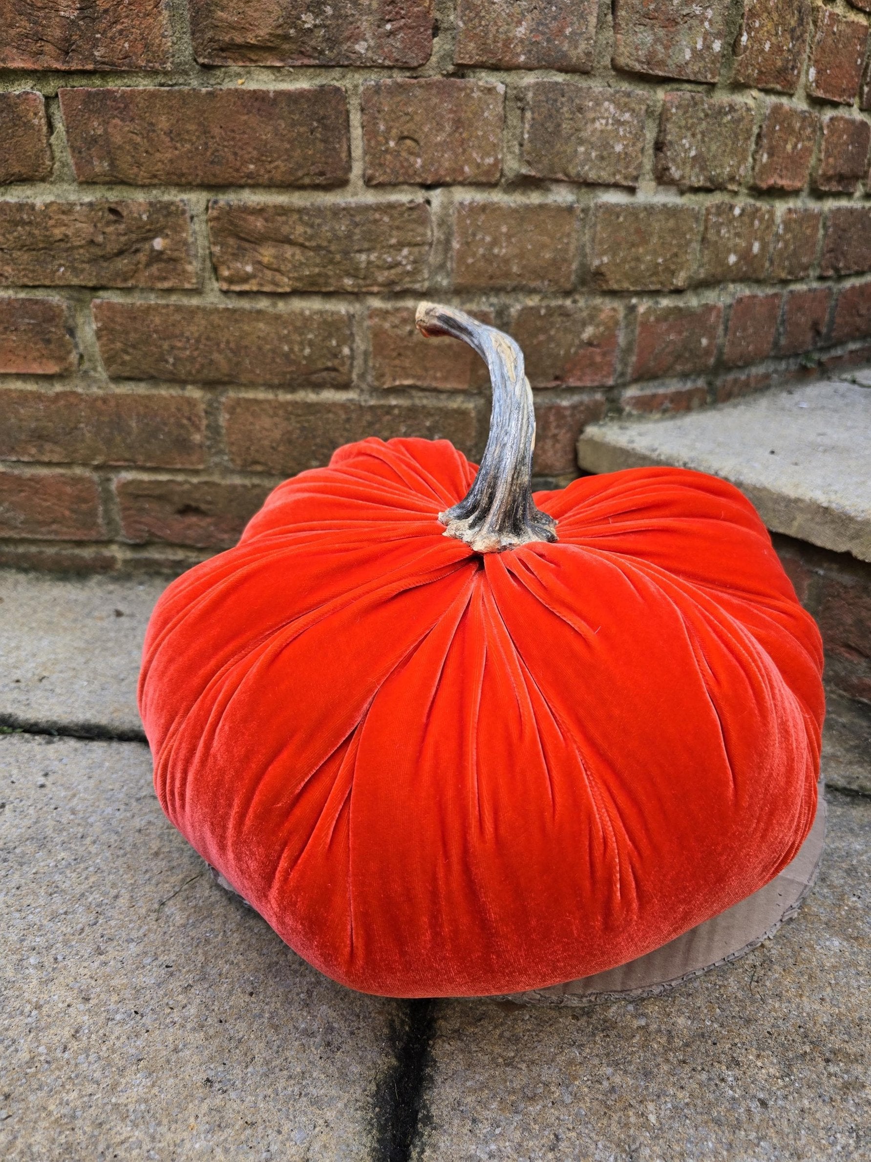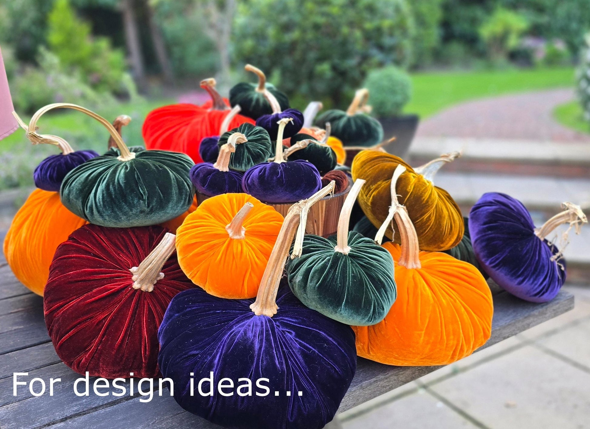 Bring warmth, richness, and seasonal charm into your home with our XL Luxury Silk Velvet Pumpkins. Each piece is carefully handmade in our London studio using authentic dried pumpkin stems and sumptuous silk velvet. Measuring an impressive 40–41cm wide by 21–22cm tall (excluding stems), these pumpkins make a statement while retaining their natural, one-of-a-kind character.